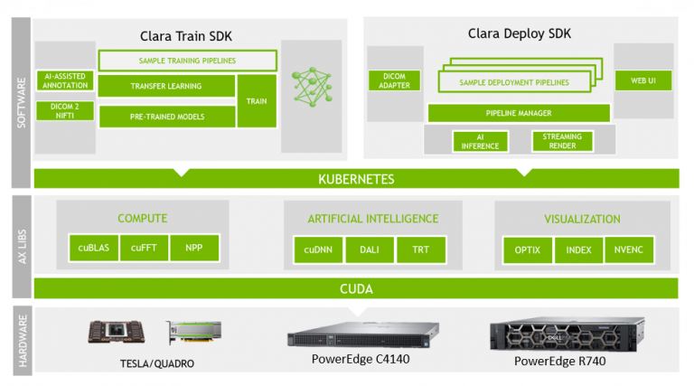 To help organizations put Clara AI to work, NVIDIA offers the Clara Deploy SDK. This Helm-packaged software development kit encompasses a collection of NVIDIA GPU Cloud (NGC) containers that work together to provide an end-to-end medical image processing workflow in Kubernetes. NGC container images are optimized for NGC Ready GPU accelerated systems, such as Dell EMC PowerEdge C4140 and PowerEdge R740xd servers.